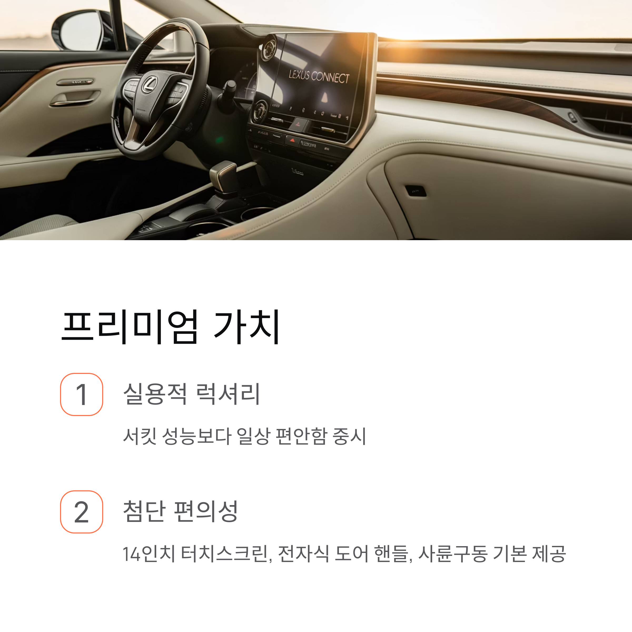 • 가치: 하지만 매일 경험하는 최고의 승차감, 뛰어난 연비, 그리고 렉서스만의 뛰어난 정숙성과 내구성을 고려한다면, 그 가치는 가격으로 환산하기 어렵습니다.