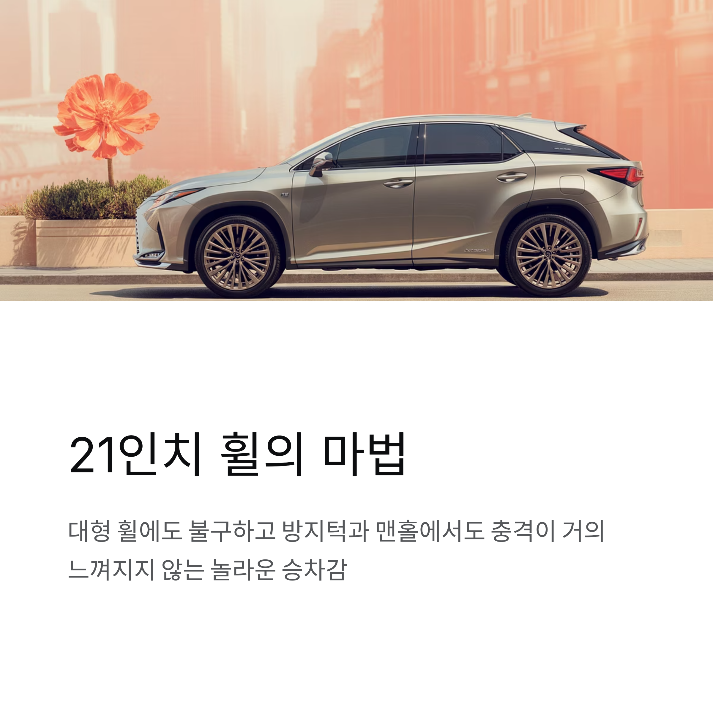 • 21인치 휠의 마법: 일반적으로 대형 휠은 승차감 저하를 초래하지만, RX350h는 21인치 휠을 장착하고도 탁월한 승차감을 제공합니다. 서울 시내의 방지턱이나 맨홀 덮개를 지날 때도 충격이 거의 느껴지지 않아 놀라움을 선사합니다. 에어 서스펜션이 아님에도 불구하고 이뤄낸 기술력은 렉서스만의 독보적인 강점입니다.
