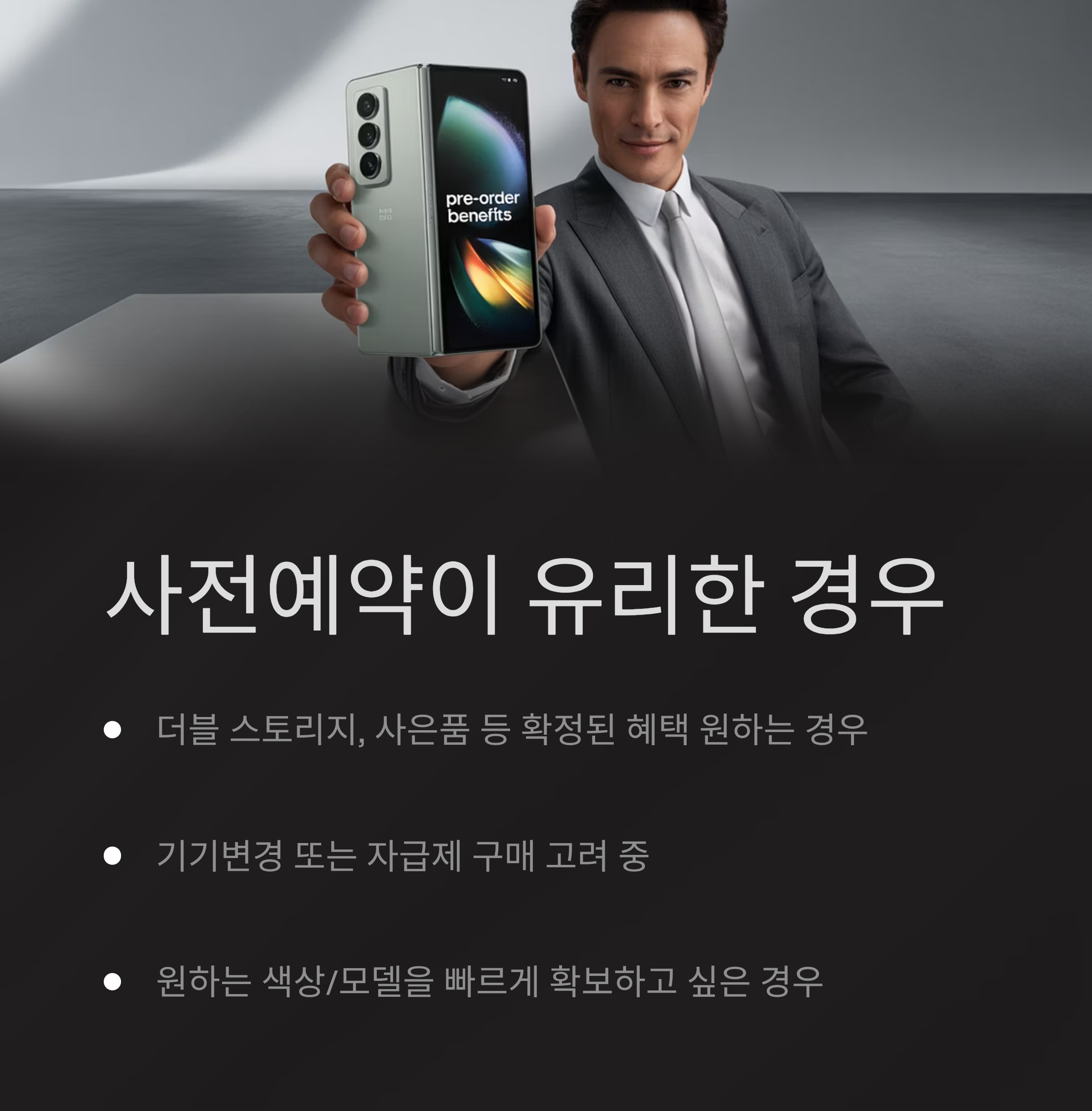 Q. 갤럭시 폴드 7 사전예약하면 할인 혜택은 끝인가요? A. 아니요, 갤럭시 폴드 7 사전예약은 공시지원금 외에도 추가지원금, 사은품, 더블 스토리지 등 다양한 혜택을 받을 수 있어요. 자급제 구매도 대부분 적용된다는 점 참고해 주세요!