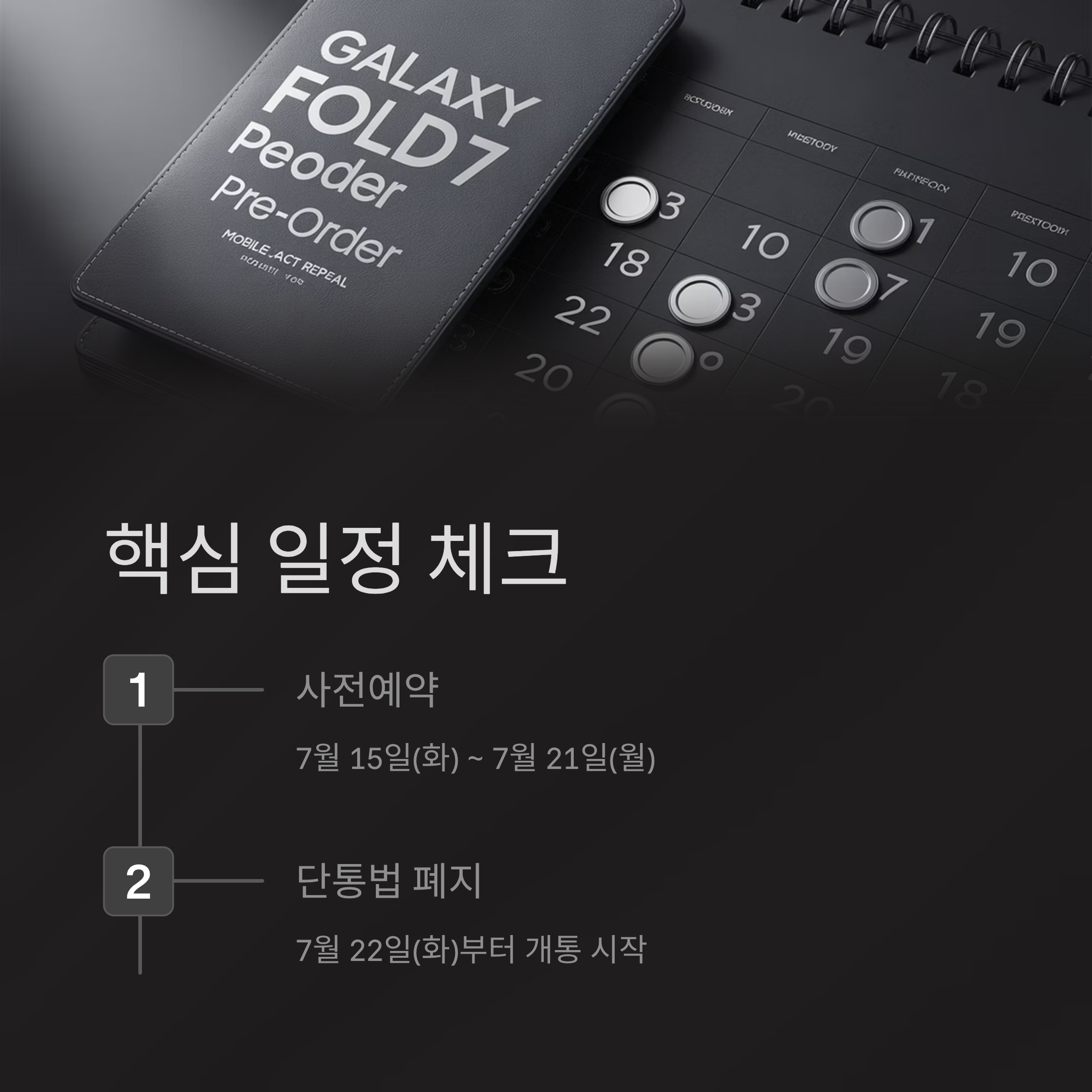 올여름, 스마트폰 시장의 가장 큰 화두는 단연 갤럭시 폴드 7 출시단통법 폐지입니다. 두 빅 이벤트가 거의 같은 시점에 맞물리면서, 지금 스마트폰을 바꾸려는 분들은 누구나 이런 고민을 하고 계실 거예요. "지금 갤럭시 폴드 7 사전예약을 할까? 아니면 7월 22일 이후 단통법 폐지로 인한 가격 경쟁을 노려볼까