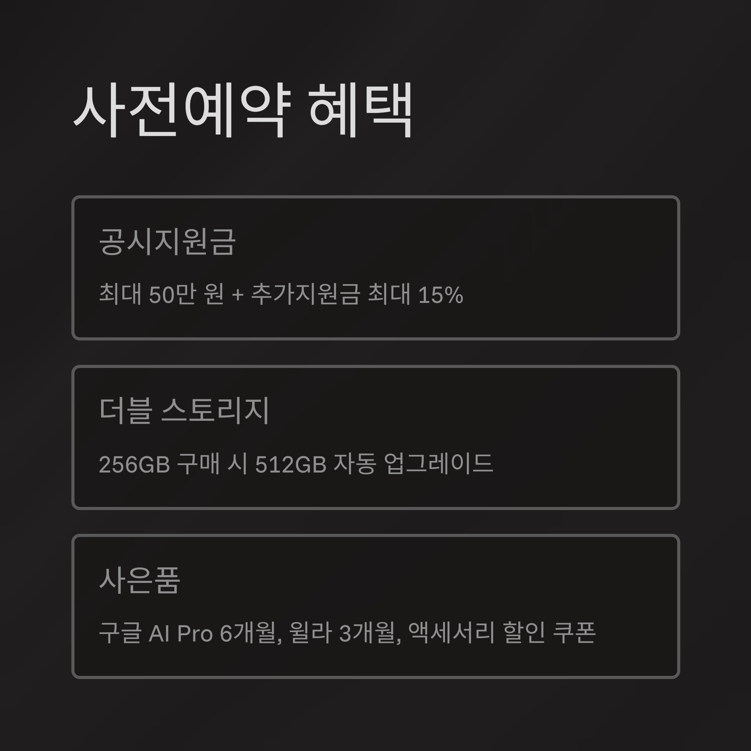 • 공시지원금 최대 50만 원 + 추가지원금 최대 15%: 통신사를 통해 구매 시 받을 수 있는 확정된 할인이에요.