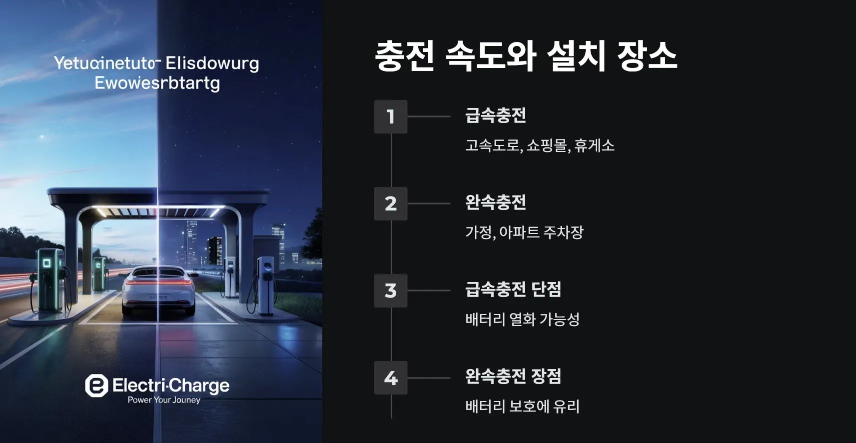 - 완속충전: 가정용 충전기, 아파트 공동주차장 등