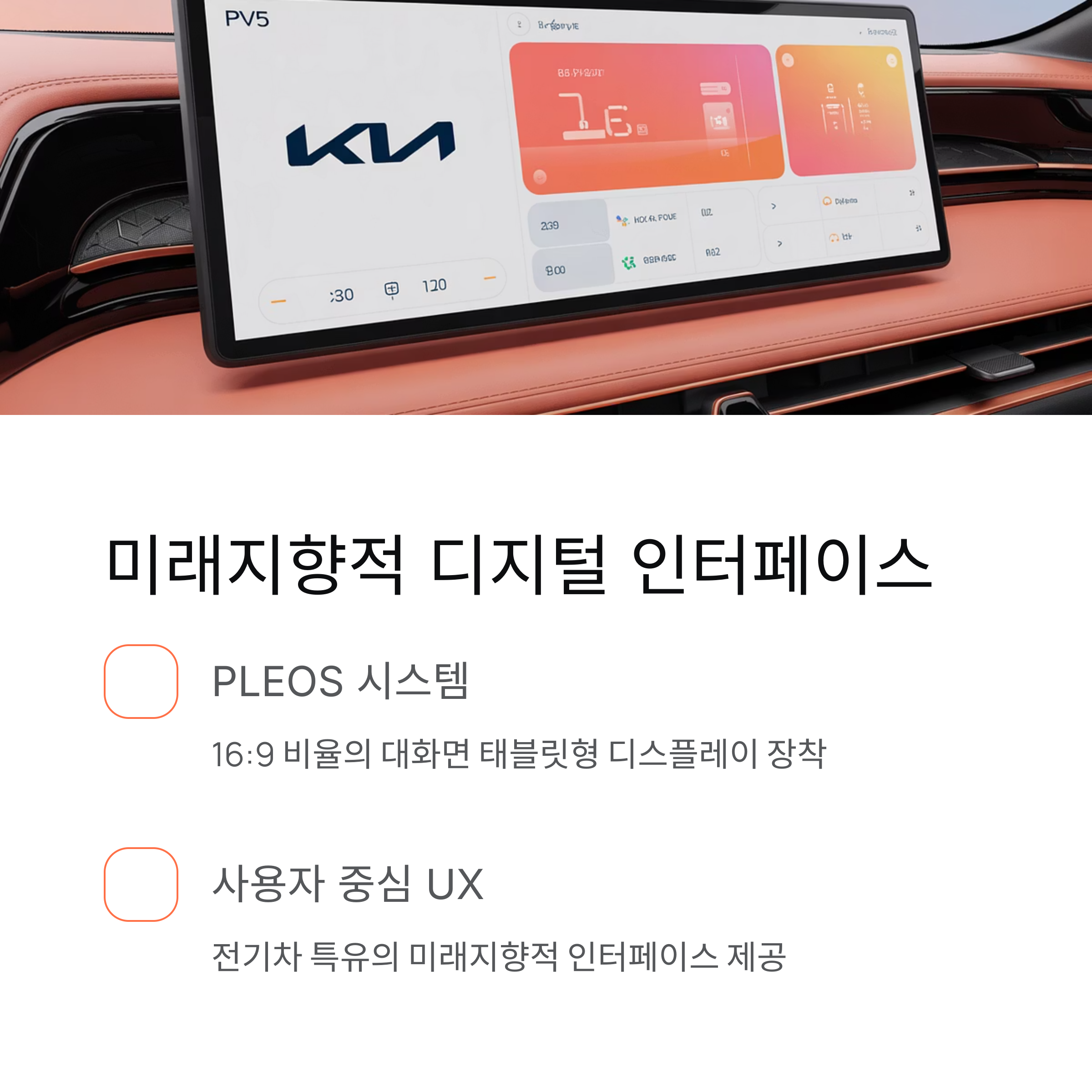 기아는 PV5에 기존 차량들과는 다른 IVI(인포테인먼트 시스템)를 적용했습니다. PLEOS 기반의 신형 시스템으로, 16:9 비율의 대화면 디스플레이가 태블릿처럼 장착되어 있어 시각적인 만족도는 물론 조작 편의성까지 향상되었습니다. 기아 PV5 캠핑카 전기차만의 감각적인 실내 구성은 전기차 특유의 미래지향적 이미지를 강화시키며, 사용자 중심의 UX를 제공하고 있습니다.