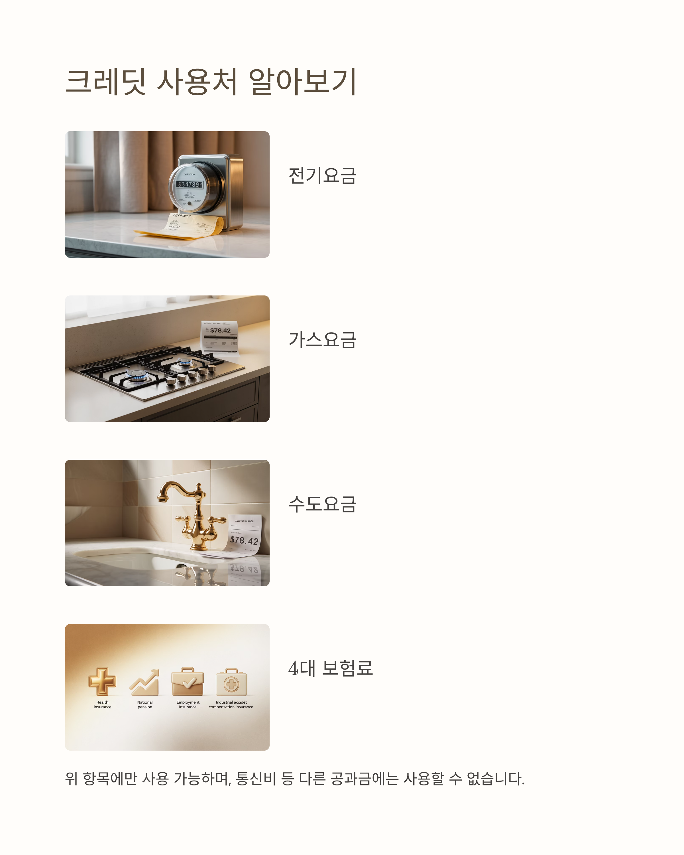 A: 전기, 도시가스, 수도 요금과 4대 보험료에만 사용 가능하며, 통신비 등 다른 공과금에는 사용할 수 없습니다.