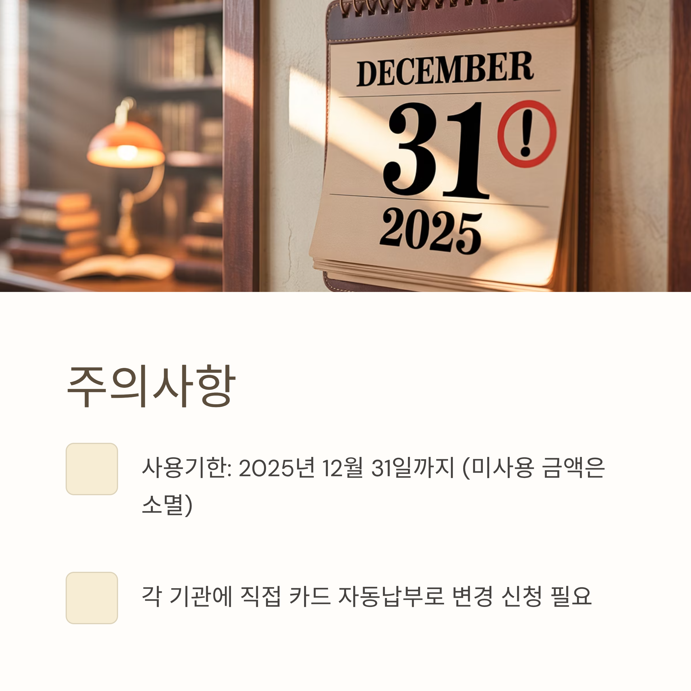 - 카드 자동납부 변경: 앞서 설명했듯이, 기존에 계좌 자동이체를 이용했다면 크레디트가 지급된 신용카드로 납부 방식을 반드시 변경해야 합니다. 이는 한전, 가스회사, 4대 보험 공단 등 각각의 기관에 직접 신청해야 합니다.