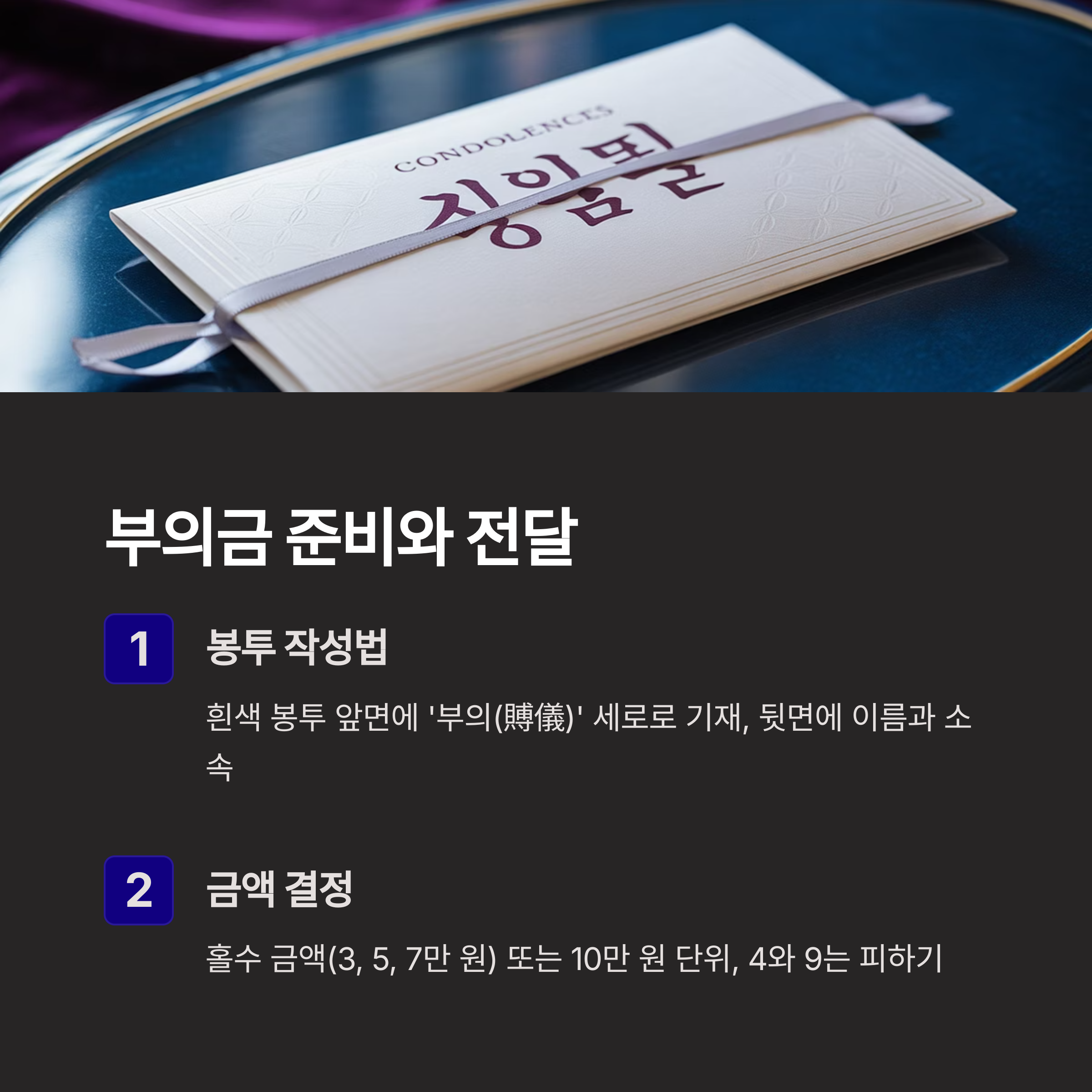 부득이하게 조문이 어려운 경우: 인편 전달(봉투에 이름 명확히 기재) 또는 계좌 이체(이체 기록에 이름 명확히 기재 + 위로 문자/전화 필수)를 활용할 수 있습니다.