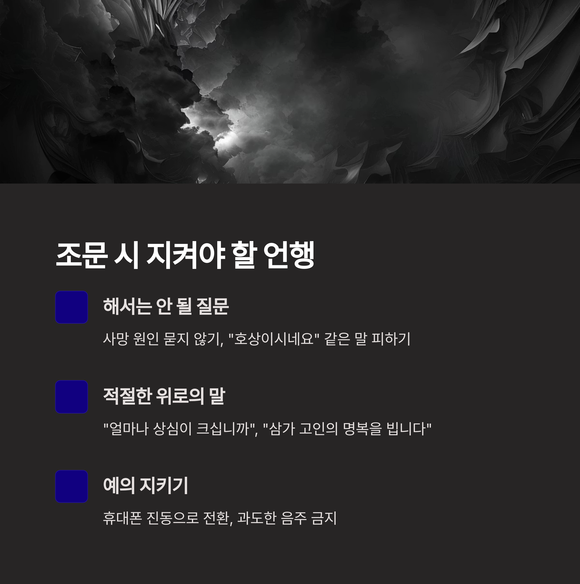 • 해서는 안 될 질문: 유족에게 고인의 사망 원인에 대해 상세히 묻지 않는 것이 가장 중요합니다. "어떻게 돌아가셨나요?"는 유족에게 가장 상처가 되는 질문 중 하나입니다. "호상(好喪)이시네요"와 같은 말도 유족의 슬픔을 멋대로 재단하는 실례가 될 수 있습니다.