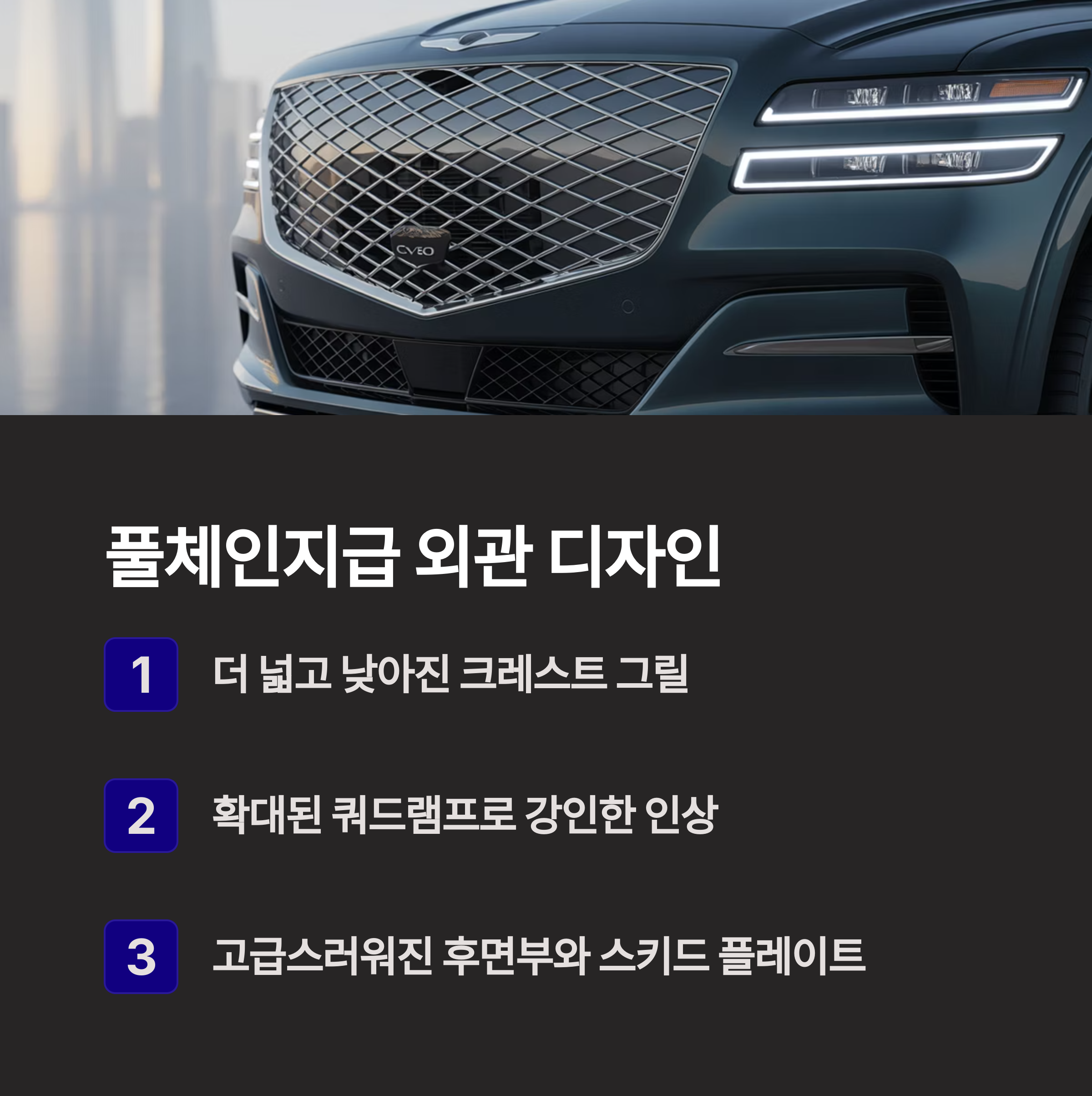 • 전면부: 제네시스의 시그니처인 크레스트 그릴이 더욱 넓고 낮게 배치되었으며, 쿼드램프의 면적이 확대되어 시인성과 강인함이 동시에 강조됩니다.