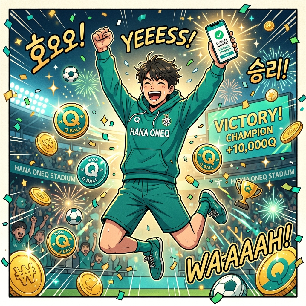 A. 하나원큐 앱 실행 후 ‘하나원큐 축구Play’ 클릭, 이어서 ‘퀴즈HANA’를 선택하고 문제 정답을 맞히면 원큐볼을 받을 수 있다더라고요.