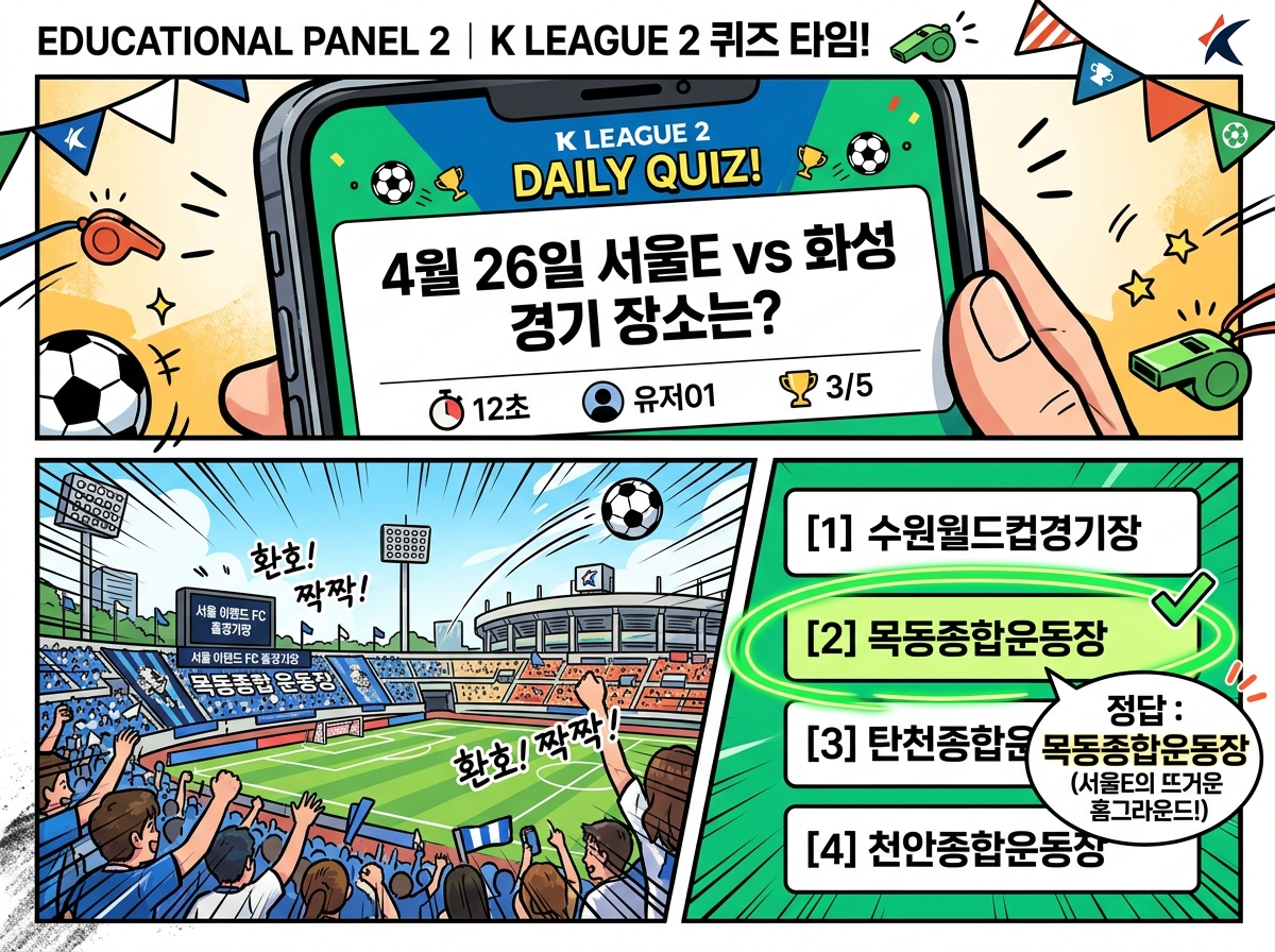 오늘, 4월 27일 하나원큐 축구퀴즈는 4월 26일 K리그2 서울E와 화성의 경기 장소를 묻는 문제였어요. 이런 유형은 언뜻 보기에 어려워 보일 수 있지만, 사실 경기 날짜와 팀 이름을 꼼꼼히 살펴보면 힌트를 얻을 수 있긴 해요.