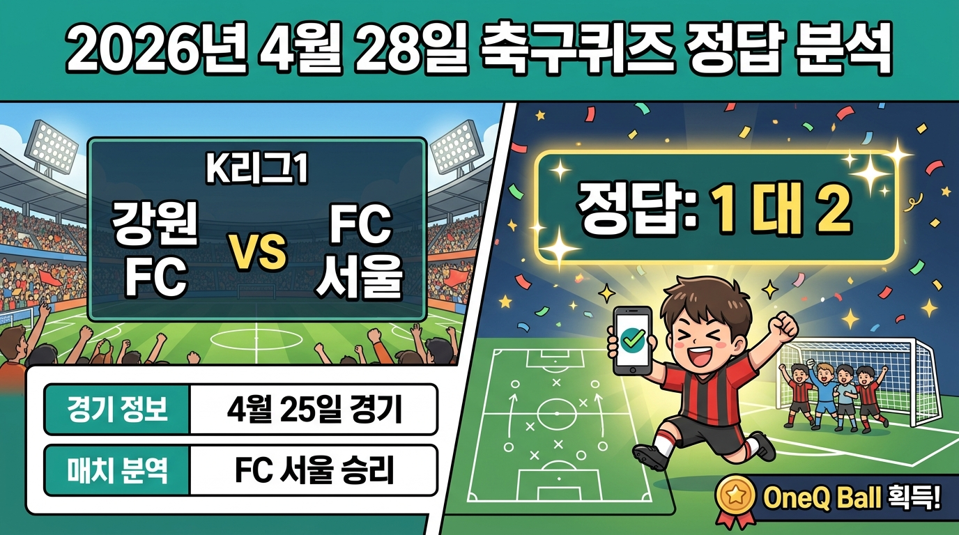 2026년 4월 28일, 하나원큐 축구퀴즈에서는 4월 25일에 열렸던 K리그1 강원 대 서울 경기의 최종 스코어를 묻는 문제가 나왔었죠. 이때 가장 중요한 건 강원과 서울의 순서대로 점수를 파악하는 거였어요.