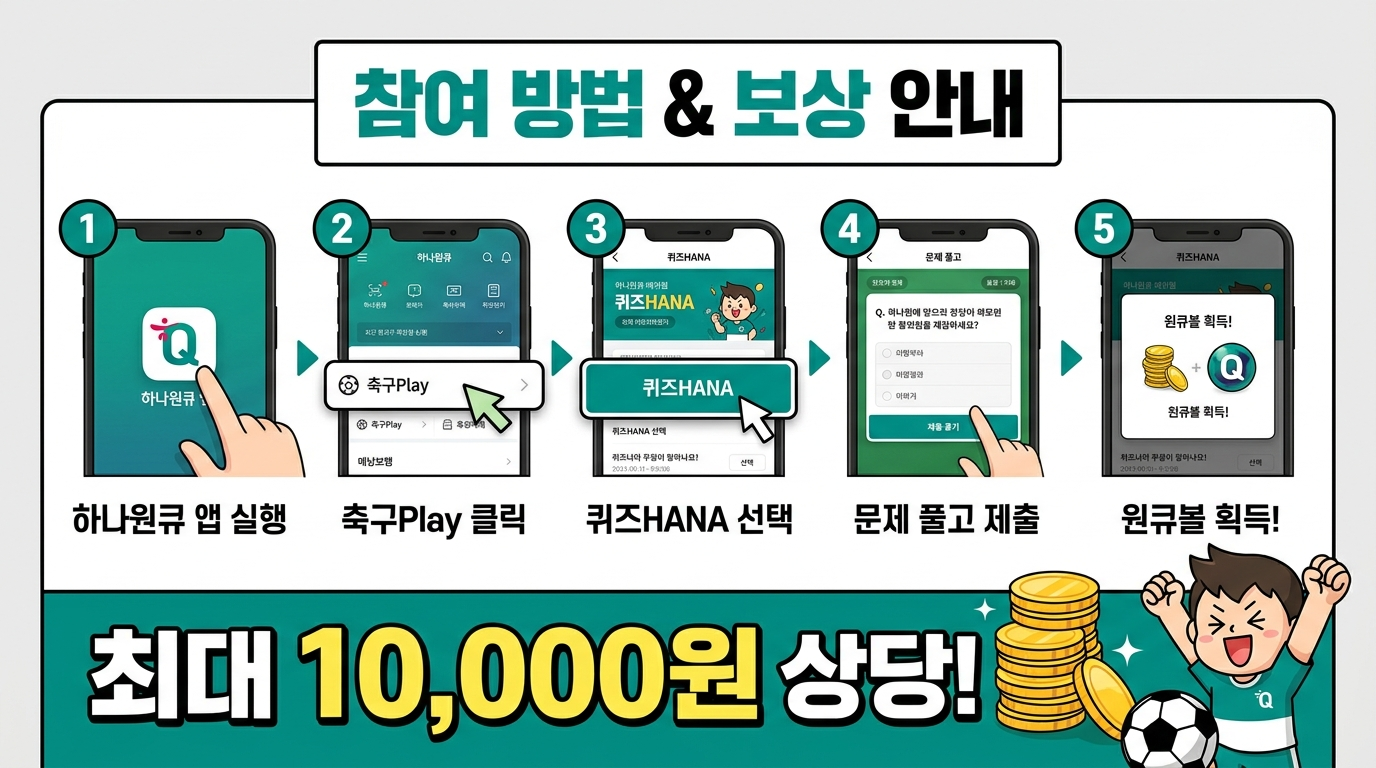 문득, 처음에는 단순히 축구 팬들을 위한 이벤트인가 싶었어요. 알고 보니 간단한 객관식 문제로 누구나 쉽게 참여할 수 있었고, 매일 최대 10,000원 상당의 원큐볼을 받을 수 있다니까 보상이 꽤 컸던 거예요.