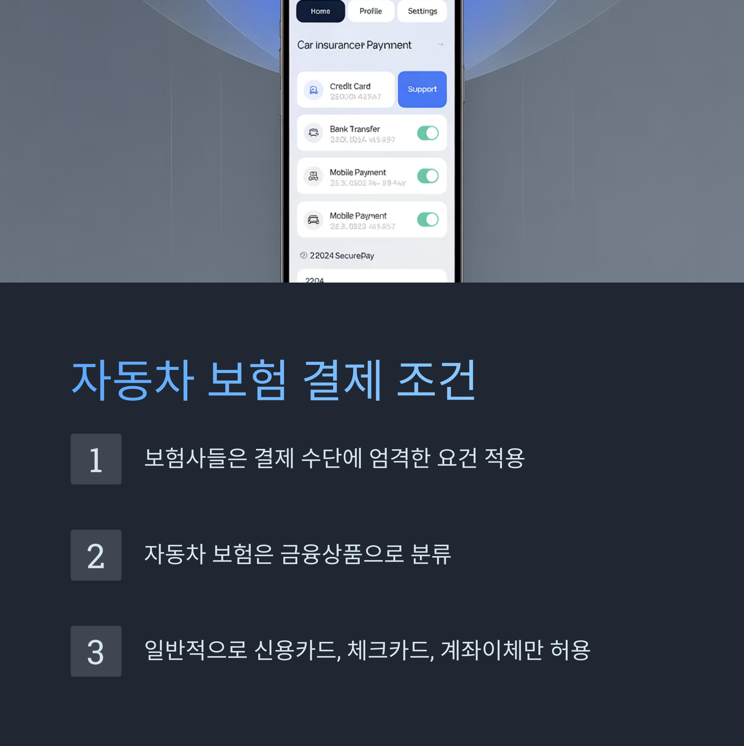 대부분의 보험사, 특히 다이렉트 자동차 보험사들은 결제 수단에 대해 엄격한 요건을 적용합니다. 자동차 보험은 단순 소비가 아닌 금융상품이기 때문에, 일반적인 신용카드·체크카드·계좌이체·간편 결제 외에는 대부분 허용되지 않아요. 즉, 휴대폰 소액결제 카드 자동차 보험 결제는 보편적으로 지원되지 않는 편입니다.
